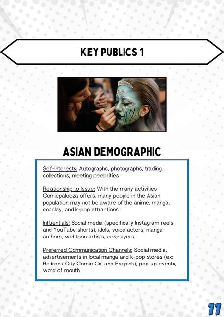 Working in a collaborative team environment, we conducted audience research, developed a SWOT analysis, identified communication gaps, and proposed strategic objectives tailored to key demographics, including Gen Z and the Asian community. We designed a comprehensive campaign that included influencer partnerships, targeted pop-up events, content strategies for social media, and storytelling elements that highlighted the inclusive and community-focused identity of Comicpalooza.
