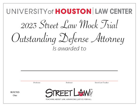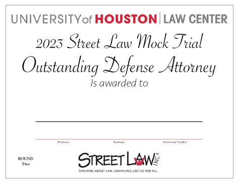 As part of the University of Houston’s Street Law initiative, I was asked to design certificates for high school students who completed the program and participated in its culminating mock trial event. The program pairs law students with local high schools to teach essential legal concepts, helping young participants understand their rights and develop skills in critical thinking, public speaking, and legal reasoning.